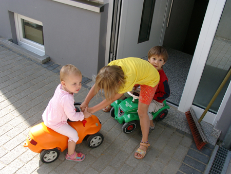das ist ja sowieso ganz erstaunlich. zu fremdkindern sind die beiden ja immer ganz zuckersuess, gegenseitig hauen die sich aber immer auf die muetze wir bekloppt. aber: wenn es um essen und malen geht, wird immer ganz bruederlich geteilt. schon ganz frueh konnte man einem der beiden was ganz tolles, sagen wir mal dodolade, geben, und ihn dann mit der anweisung "gib dem arthur/jonathan auch einen" losschicken, und das ist jetzt so drin, dass die sich mit einem teil gar nicht mehr abgeben, sondern immer fuer den anderen direkt mitbruellen. und wenn die dodolade dann geteilt und aufgegessen ist, streitet man sich wieder bis aufs blut um das tutaauto.