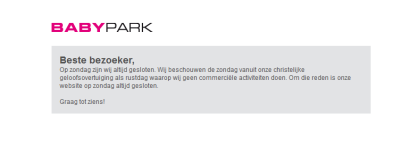 da faellt mir ja wieder mein lieblings-fundamentalisten-evangelistenbeispiel im internet ein, und da sonntag ist, kann man es sogar screenshotten. europas groesster baby-supermarkt im internet, basiert in holland, sonntags aus christlicher ueberzeugung leider ohne webseite. wat will man machen.
